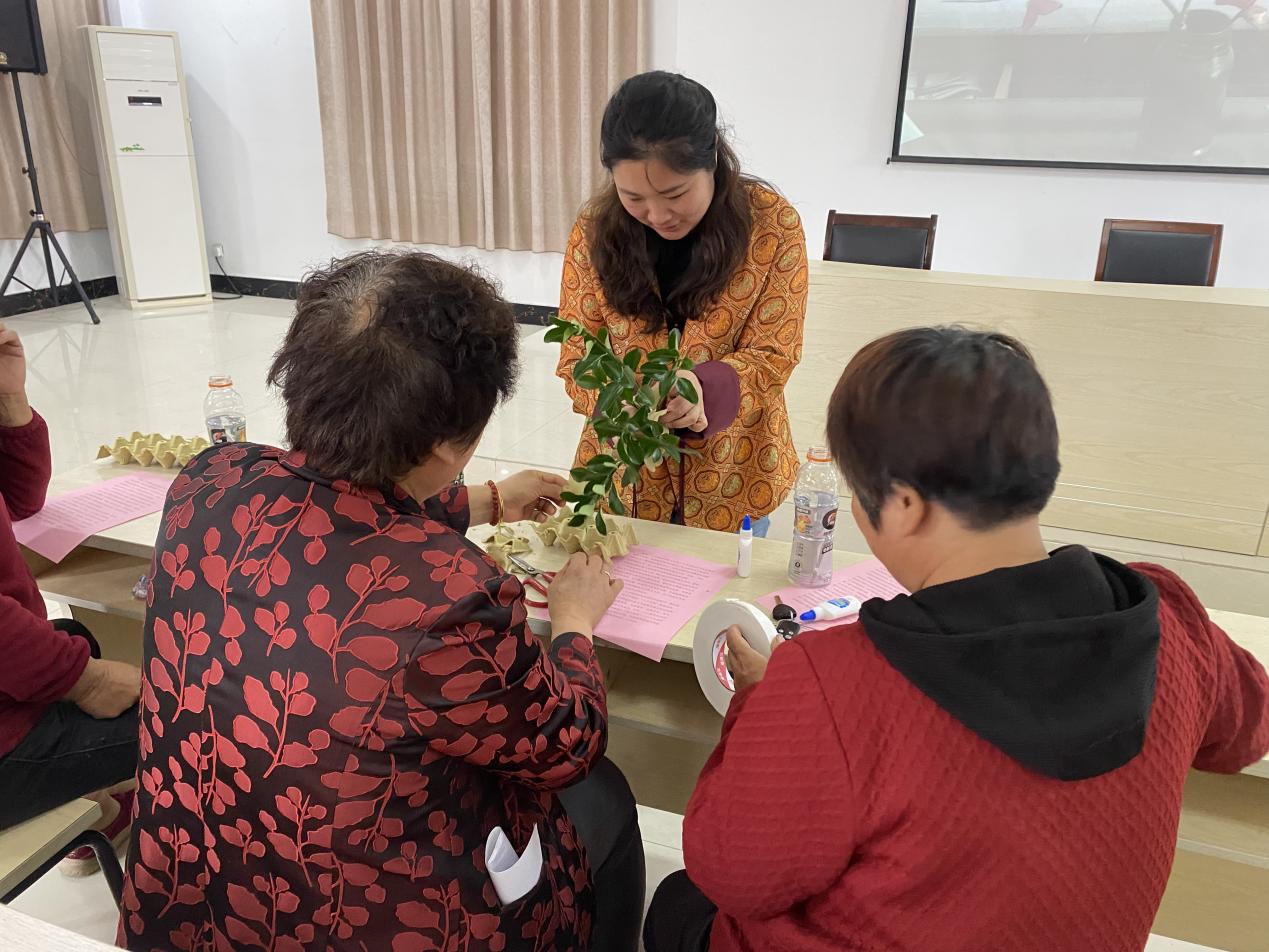 活动现场,社区工作人员准备了许多包装鸡蛋的托盘放置在桌面上,陆佳钰向老年居民们详细讲解了活动的制作流程:剪裁、修剪、固定、最后的装饰。随后,陆老师引导老人们一起动手......一板板鸡蛋托盘就变成了一朵朵形状各异的花儿,经过固定、装饰,最后摇身一变,成了一枝枝漂亮的花束,让老年居民们切身感受到“变废为宝”的妙处。