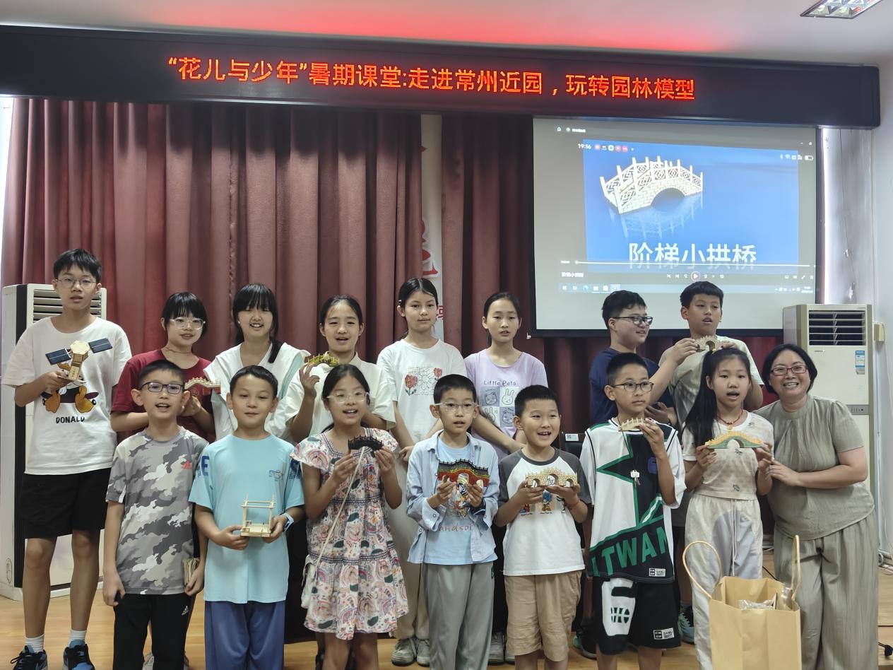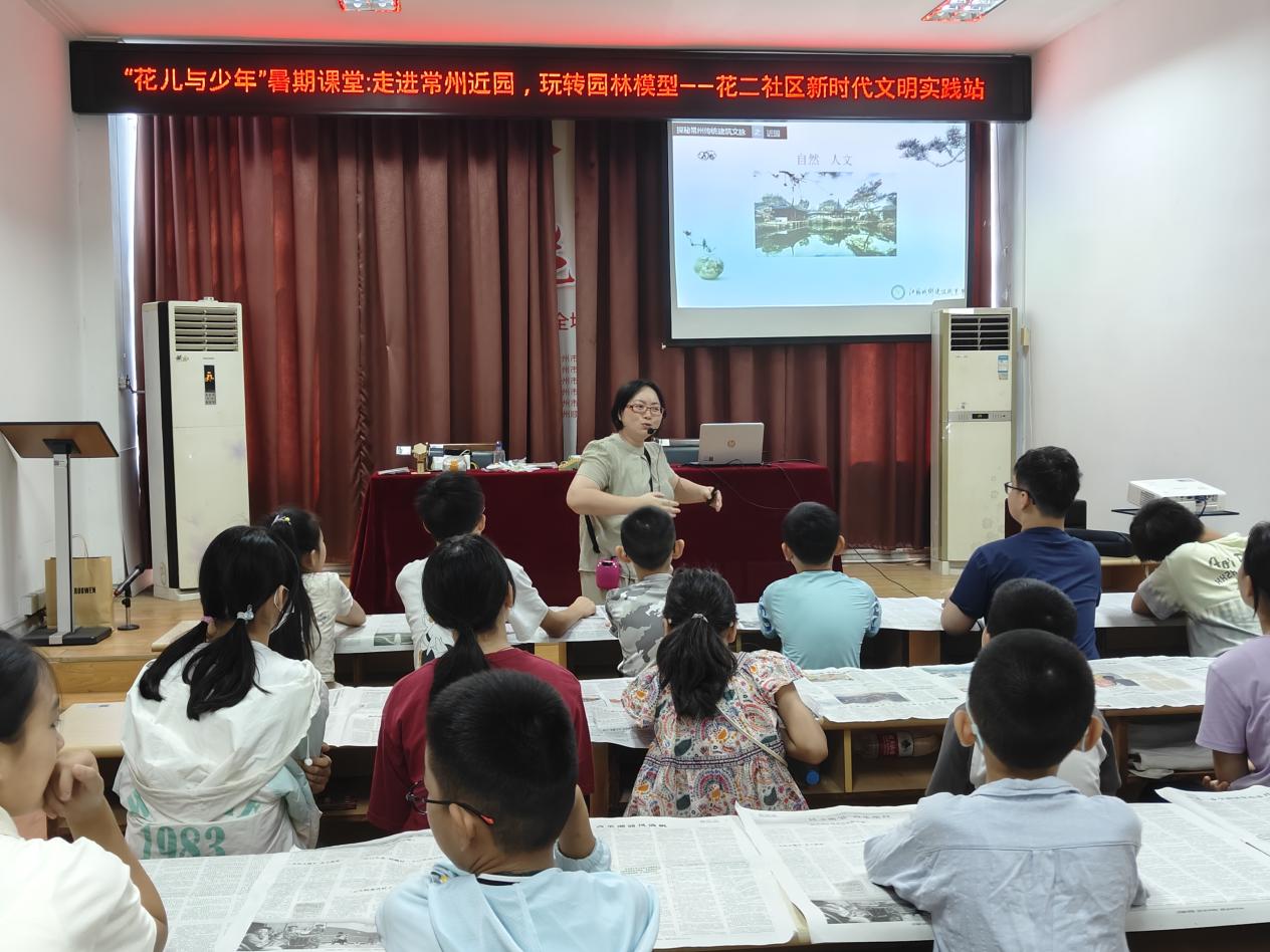 7月16日上午9:301xBET龙运传统建筑团队孟亚俐老师来到钟楼区五星街道花园新村第二社区“花儿与少年”暑期课堂,领着社区的花儿与少年走近常州近园,玩转园林模型。