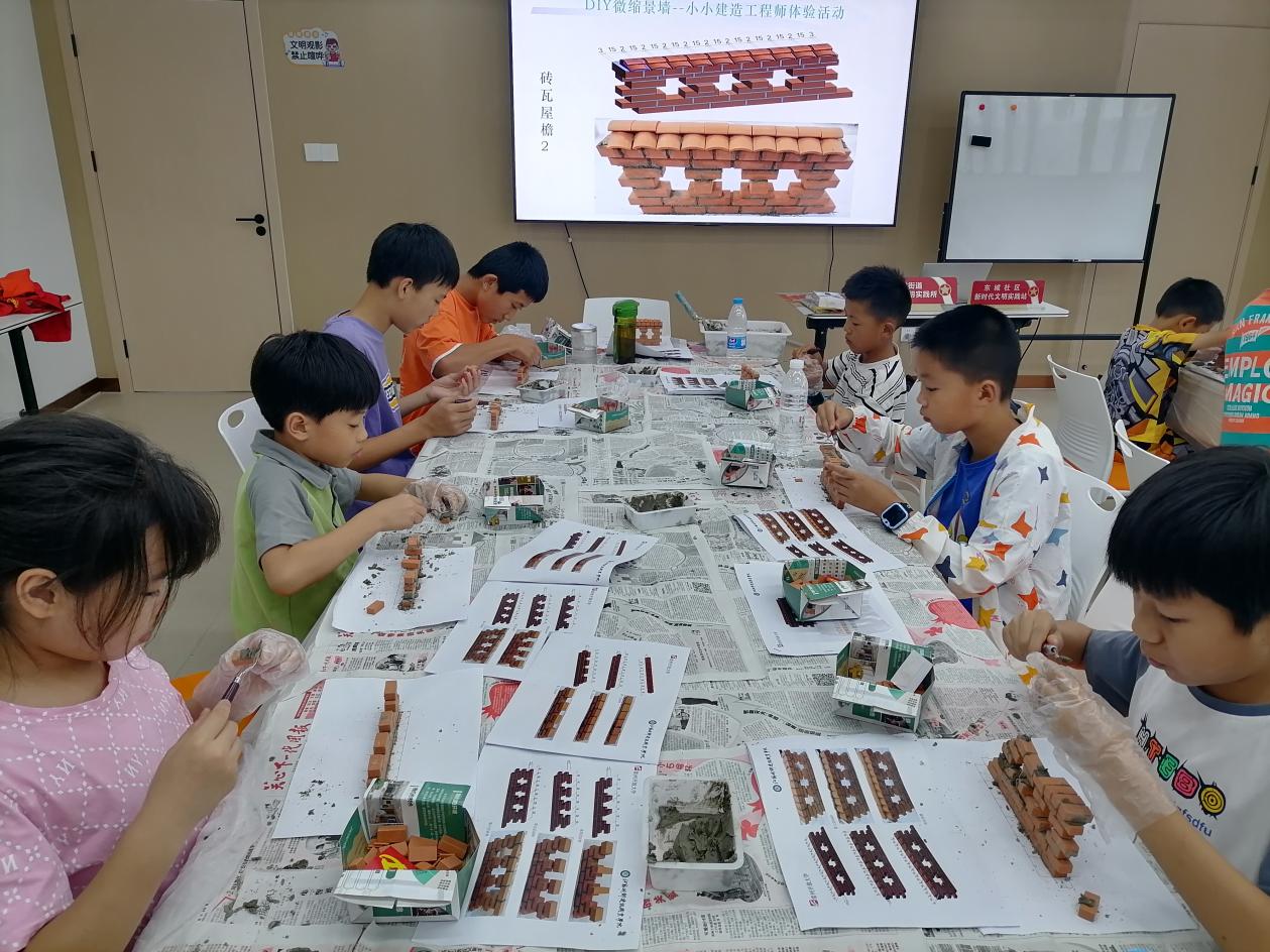 在认真聆听老师的细致介绍后,大家依照图纸步骤,开始实施。现场的老师以及志愿者全程关注各小组活动的开展,巡回指导大家。 随着放样划线、一层有一层红砖上墙、屋檐瓦片铺砌等步骤的有序实施,一个个精致的小红楼渐渐展现在大家眼前。 此次活动不仅是一次建筑建造技能体验,更是一次深刻的心灵之旅。这次活动对于孩子们的成长和发展具有积极的意义,此次活动不仅丰富了辖区青少年的课余生活,更让他们在体验中感受到了中华传统建筑文化的魅力。(文/图 蔡雷 初审/凌晓琴 终审/许明)
